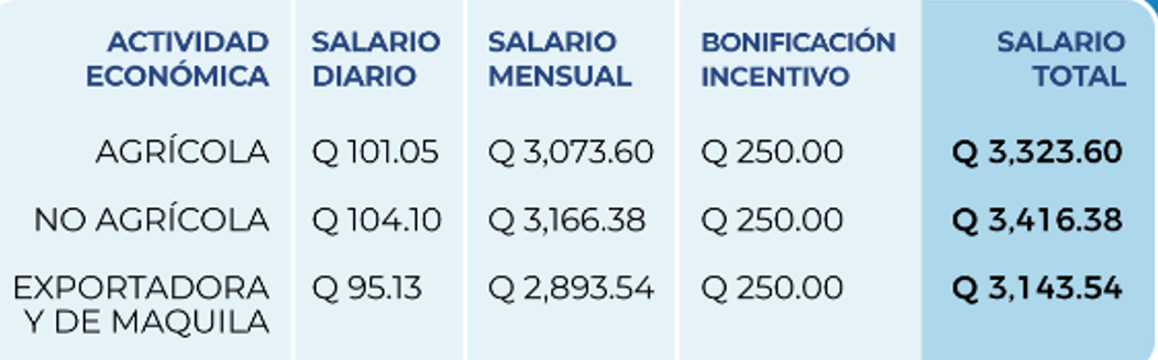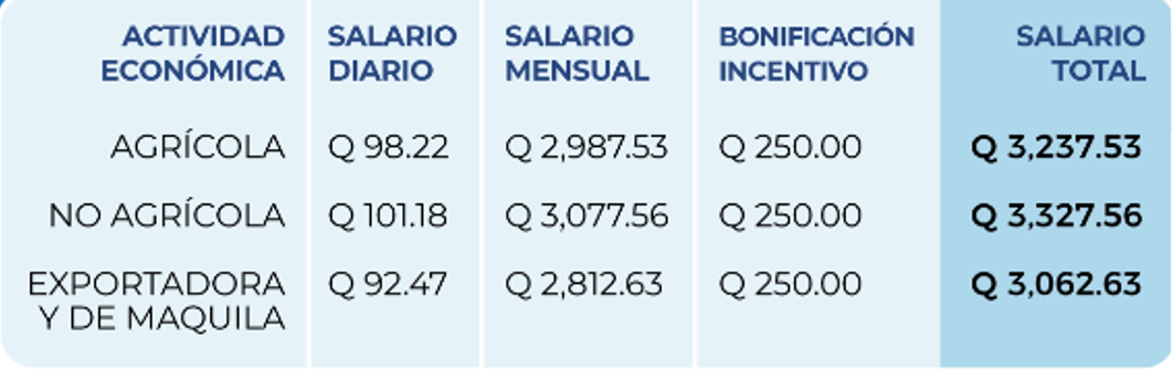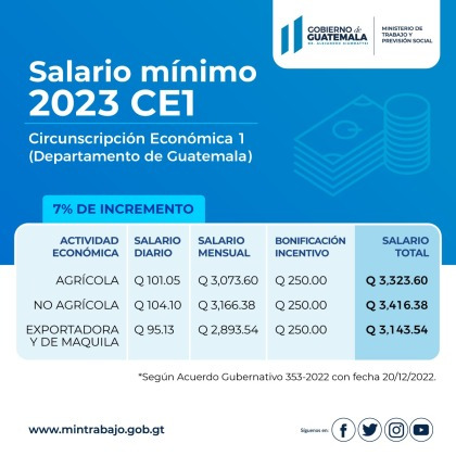 El día de diciembre de 2022 fue publicado en el Diario Oficial el Acuerdo Gubernativo No. 353-2022 del Ministerio de Trabajo y Previsión Social, el cual fija los salarios mínimos vigentes a partir del 1 de enero del año 2023, los cuales se clasifican en dos circunscripciones